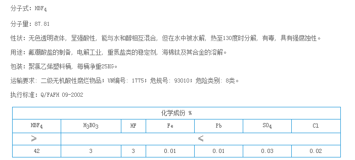 分子式:HBF4分子量:87.81性狀:無(wú)色透明液體, 呈強酸性, 能與水和醇相互混合, 但在水中被水解, 熱至130度時(shí)分解, 有毒, 具有強腐蝕性。用途:氟硼酸鹽的制備, 電解工業(yè), 重氮鹽類(lèi)的穩定...
