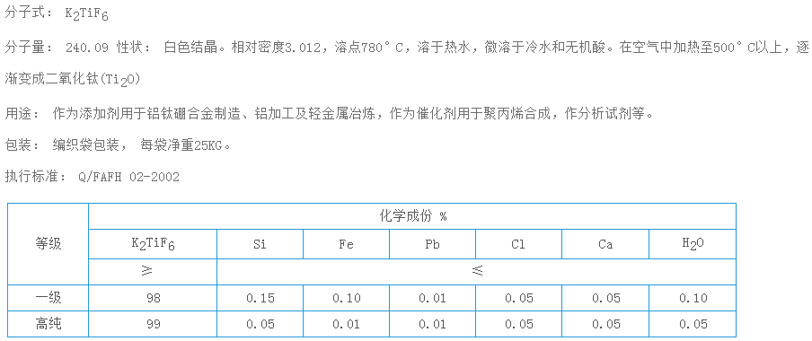 分子式: K 2 TiF 6 分子量: 240.09 性狀: 白色結晶。相對密度3.012,溶點(diǎn)780C,溶于熱水,微溶于冷水和無(wú)機酸。在空氣中加熱至500C以上,逐漸變成二氧化鈦(Ti 2 O) 用途: 作為添加劑用于...